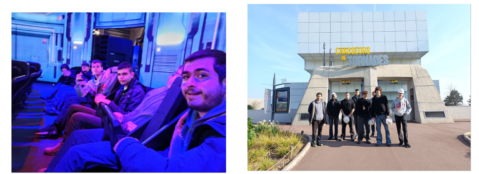 Immersion dans l’attraction Chasseurs de Tornades, avec son impressionnant disque tournant articulé sur trois supports, capable d’accueillir jusqu’à 120 personnes — une parfaite illustration concrète des notions étudiées en cours, renforcée par une démonstration sur site.
